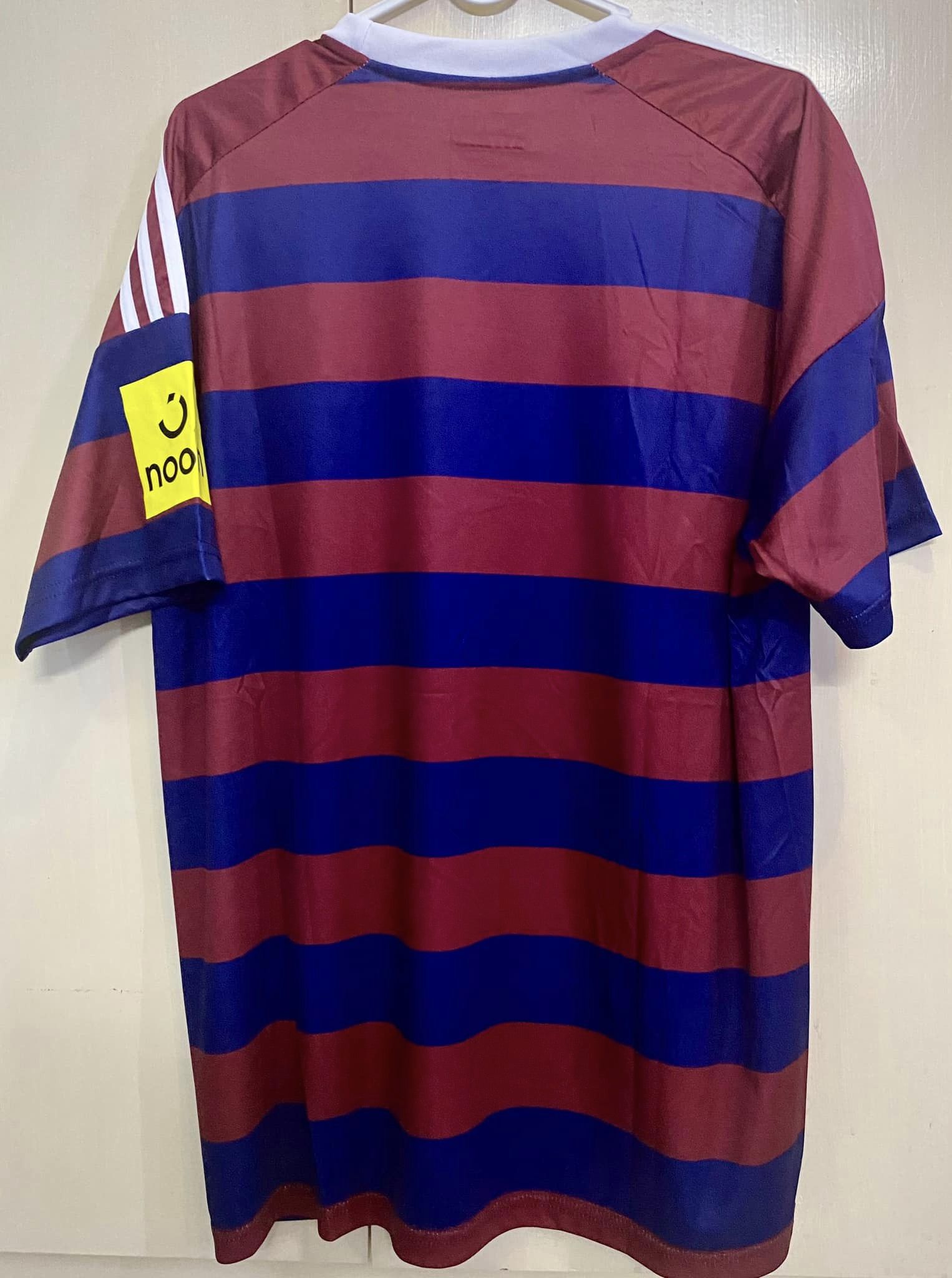 Maroon and navy hooped jersey with white shoulder stripes, contrast sleeves, and a bold athletic look.