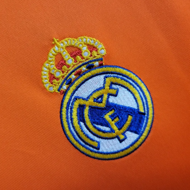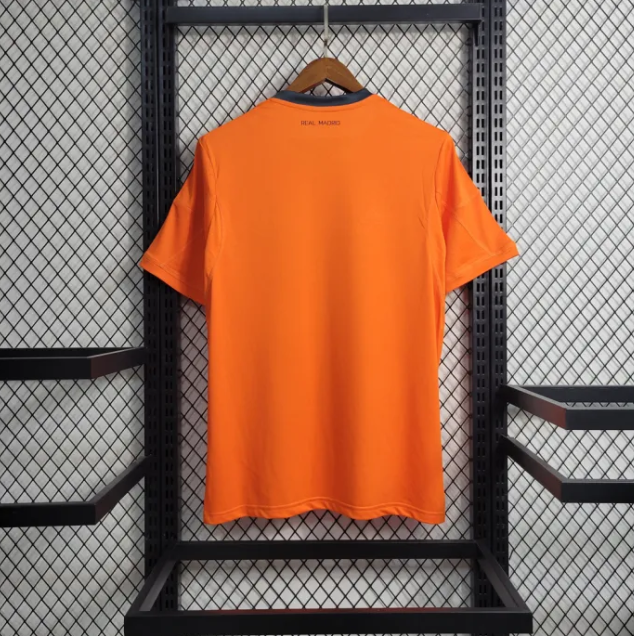 This is an orange Real Madrid football shirt featuring dark accent details and a clean sponsor logo on the front. It has a lightweight sport fabric with a modern look and a comfortable athletic fit.