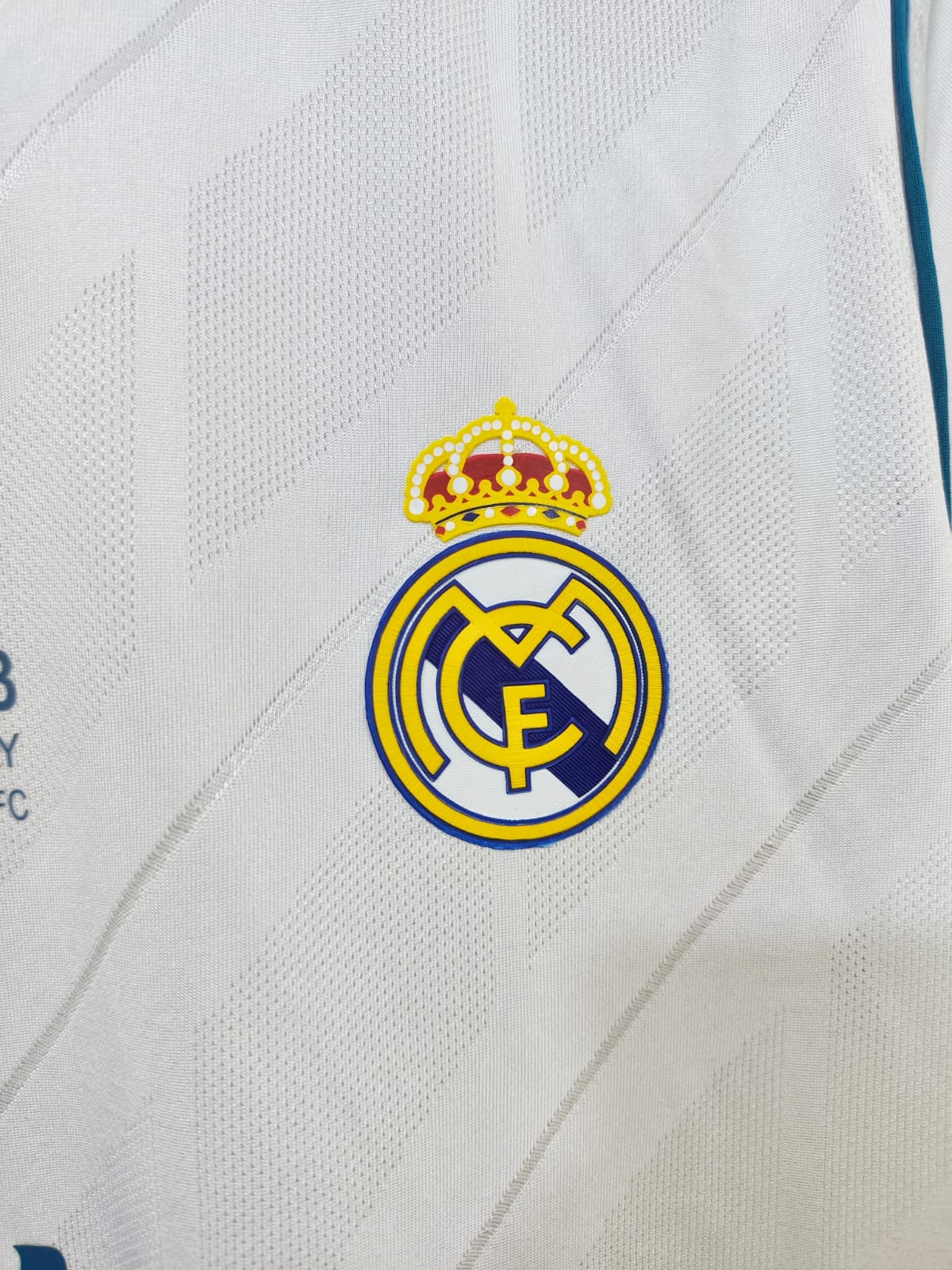 This is a white Real Madrid football shirt with blue shoulder detail and a special match print from the 2018 Kyiv final. It features a slim V-neck, lightweight fabric, and a centred sponsor mark for a clean and memorable match look.