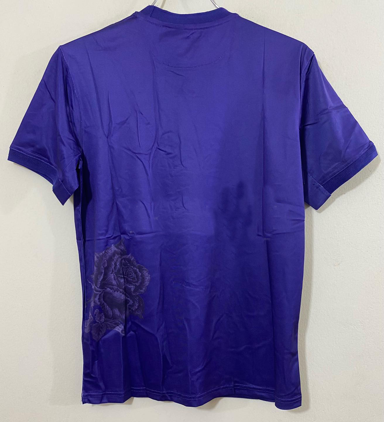 A deep-purple football jersey featuring subtle floral graphics across the front and a clean white sponsor print. The shirt includes a textured pattern all over, giving it a stylish and modern athletic look.