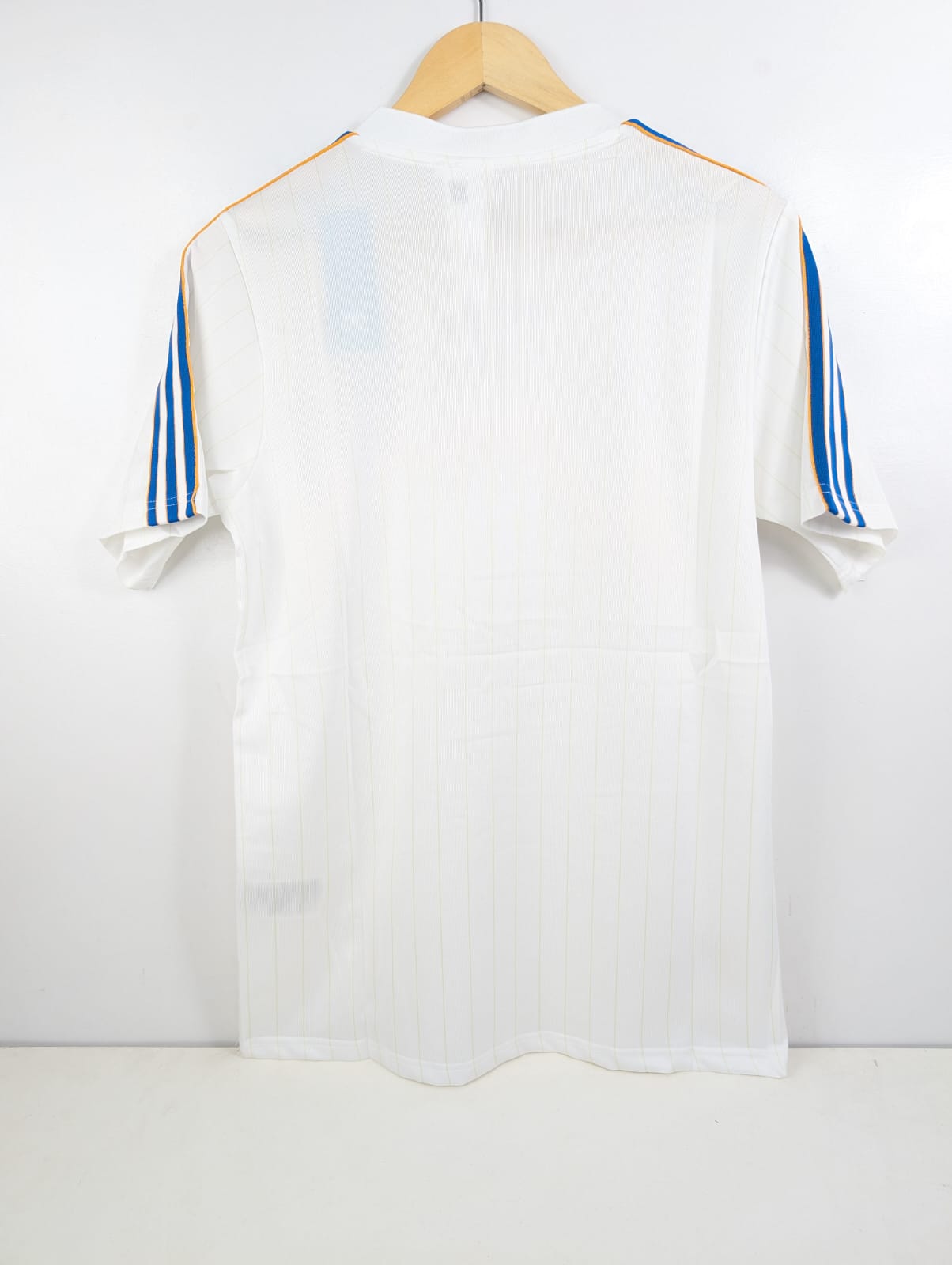 A clean white football jersey featuring subtle vertical striping and blue-orange shoulder stripes for a fresh modern look. The design includes a small chest crest and a smooth round collar, giving it a neat sporting finish. Made from soft, breathable material, suitable for daily wear, practice sessions, or casual styling.